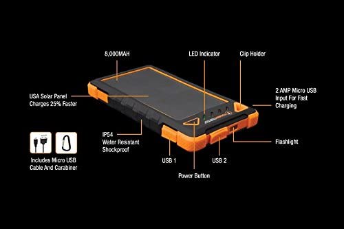8000mAh Solar Portable Charger Powerbank with LED Flashlight – IP54 Dustproof/Shockproof/Rainproof – 180mAh high Efficiency Solar Panel